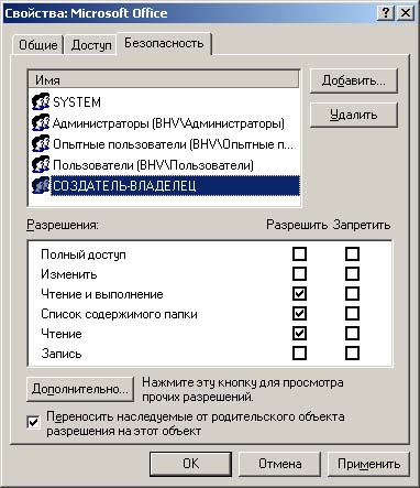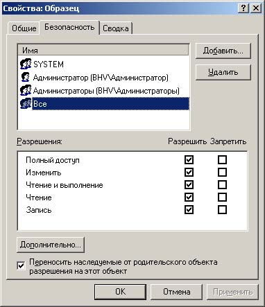 Система безопасности Windows NT/2000 позволяет устанавливать различные права доступа к файлам и папкам для пользователей и групп |