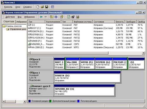 Для разбивки дискового пространства до установки Windows 2000 можно использовать программы Fdisk (для FAT) и другие утилиты (для NTFS). Следует помнить, что Fdisk "не видит" тома, сформатированные для NTFS.