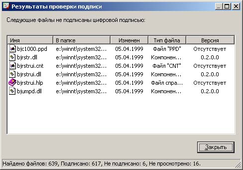 Во избежание таких проблем все системные файлы, устанавливаемые в процессе инсталляции операционной системы Windows 2000, снабжены цифровой подписью Microsoft. Если системный файл имеет подпись, это служит гарантией его совместимости с Windows 2000 и указывает на то, что данный файл либо представляет собой оригинальную версию, разработанную Microsoft, либо прошел тестирование и признан пригодным для использования с Windows 2000. Верификация цифровой подписи файлов позволяет идентифицировать все установленные на проверяемом компьютере файлы, не имеющие цифровой подписи, и получить об этих файлах следующую информацию: