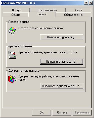 | Рис. 8.3. Вкладка Сервис (Tools) диалогового окна свойств диска позволяет быстро выполнить резервное копирование всех файлов, расположенных на этом диске |