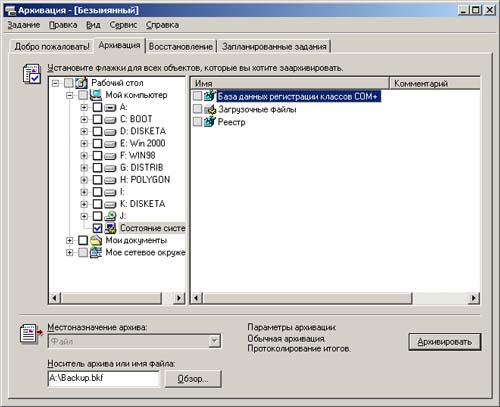 Как и в предыдущих версиях Windows NT, официально рекомендуемым методом резервного копирования и восстановления данных в Windows 2000 является использование встроенной утилиты Архивация (Backup). Однако если в Windows NT 4.0 эта программа имела ряд весьма существенных ограничений, к числу которых относились необходимость наличия в локальной системе совместимого с Windows NT ленточного устройства и весьма ограниченный список таких устройств, то в версии программы архивации, входящей в состав Windows 2000, эти недостатки устранены. Новая версия программы обеспечивает поддержку различных видов носителей резервной копии, что позволяет выполнять резервное копирование на любое устройство хранения информации, поддерживаемое операционной системой. К числу таких устройств относятся любые гибкие или жесткие диски, магнитооптические накопители и другие устройства, а не только стримеры.